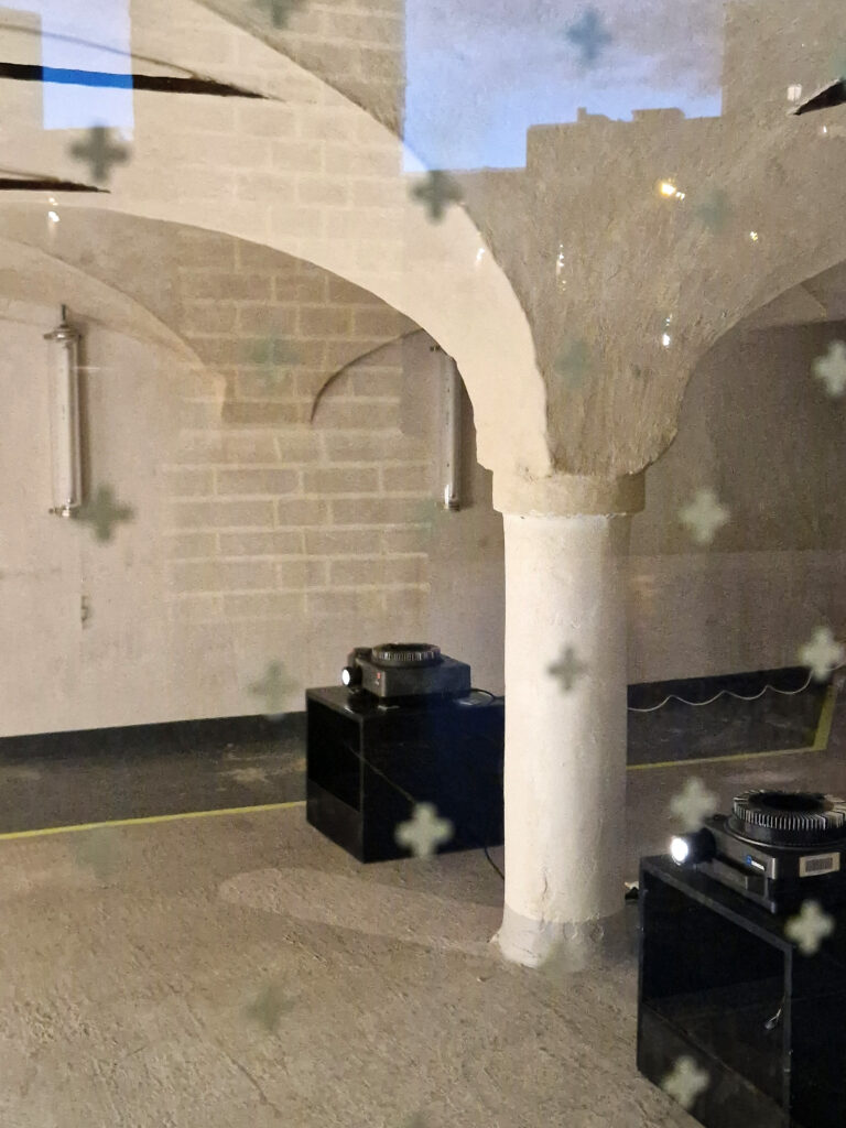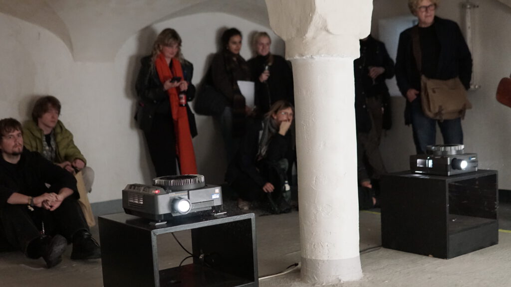 two diaprojectors, yellow tape, yellow vinyl